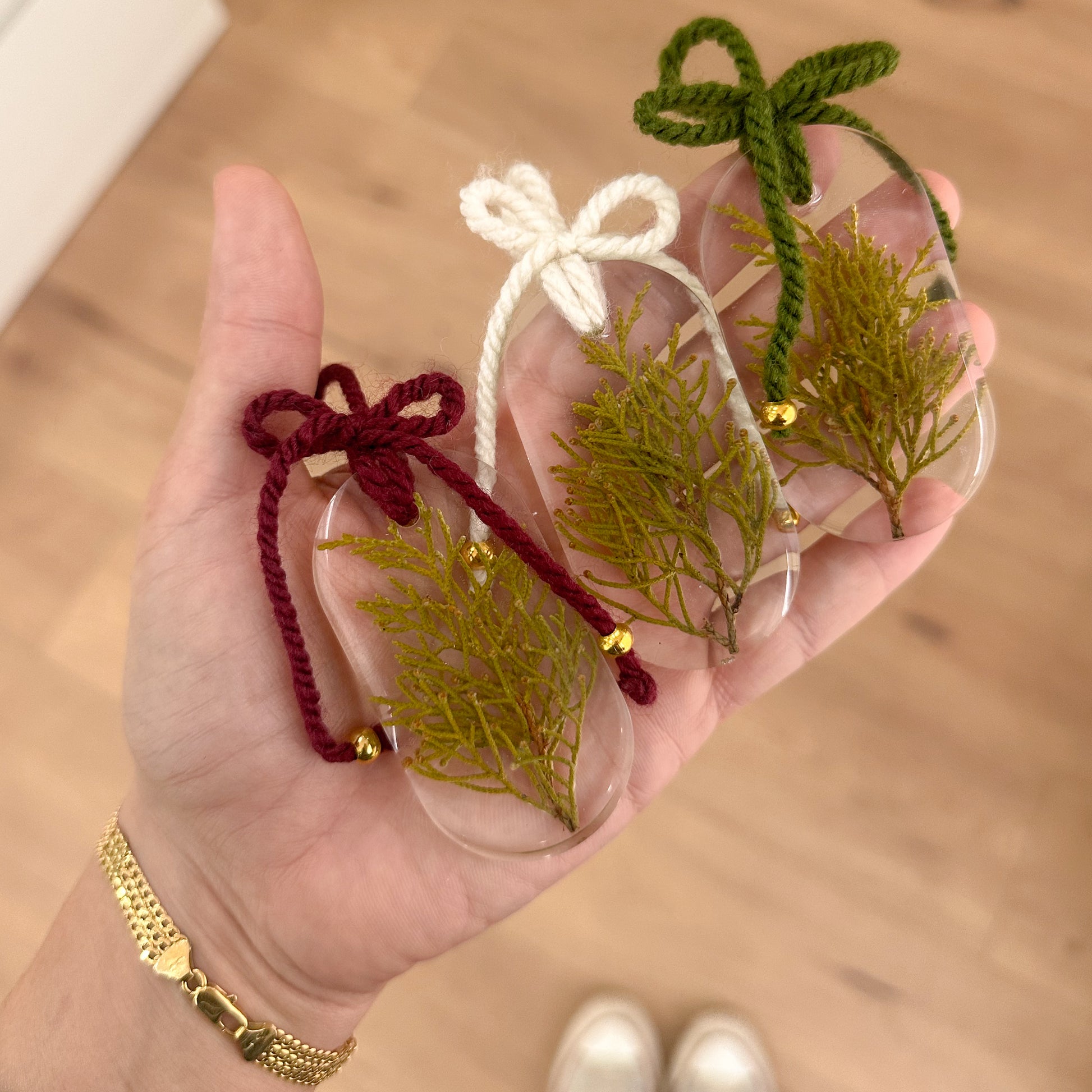 Cada peça é feita com ramos de pinheiro prensados, preservados em resina transparente e finalizados com um laço de lã artesanal nas cores verde, branco e vinho com pontinhas douradas. 🌲