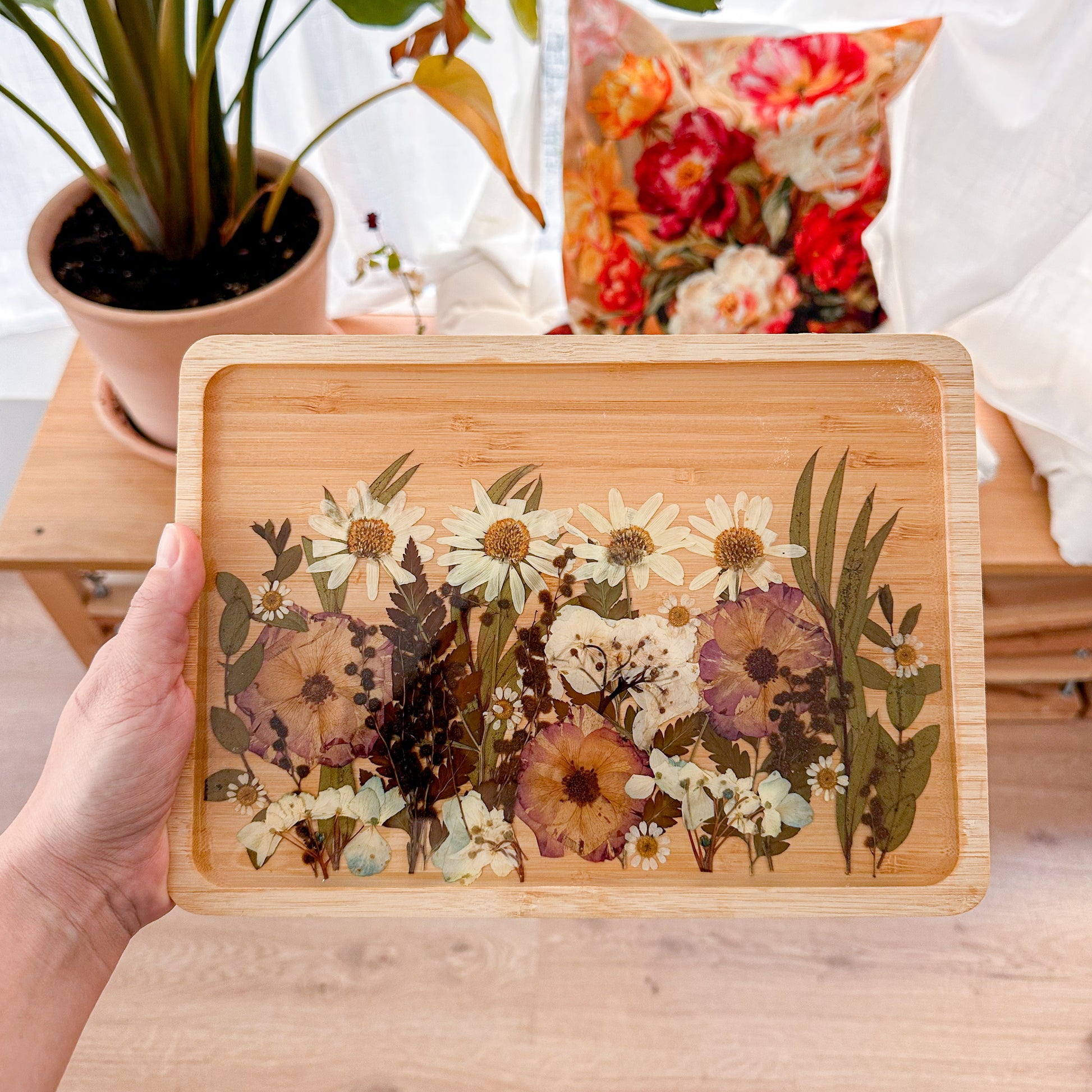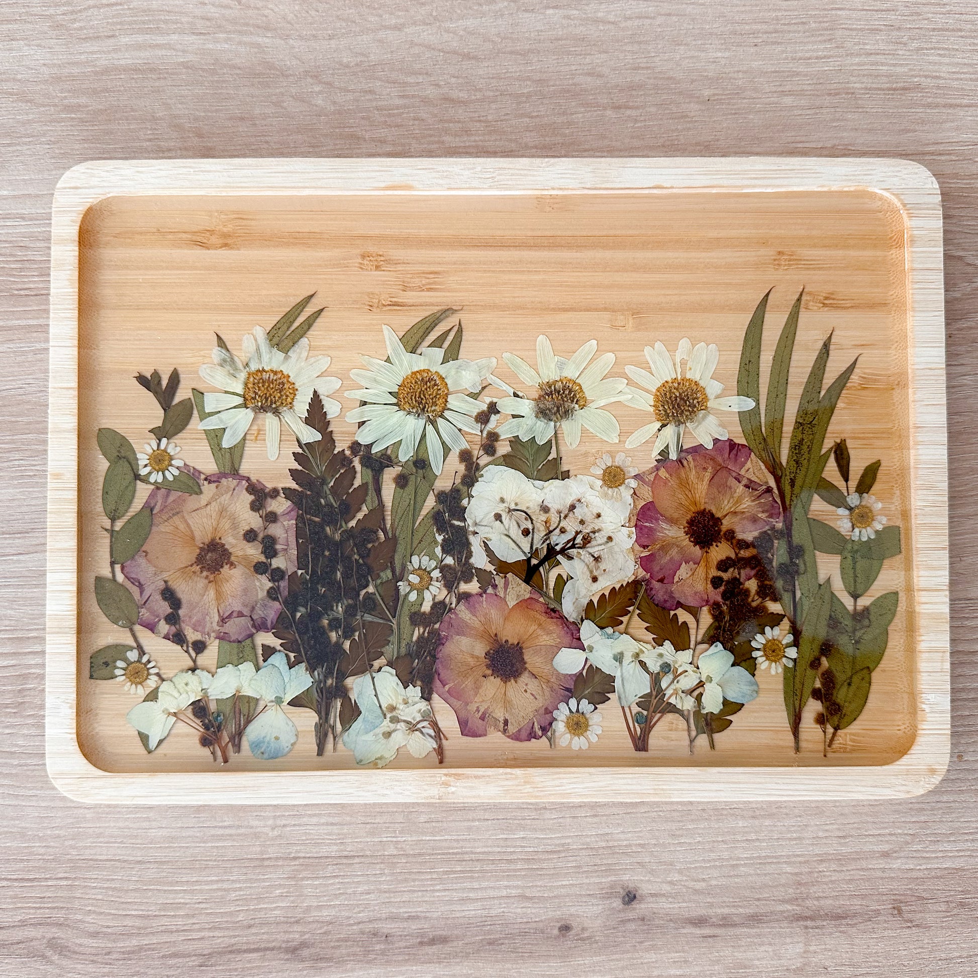 Esta peça única combina a beleza natural das flores prensadas com a sofisticação da madeira e o acabamento cristalino da resina. Cada flor foi cuidadosamente selecionada, preservada e composta manualmente para criar um arranjo harmonioso que celebra a delicadeza da natureza.