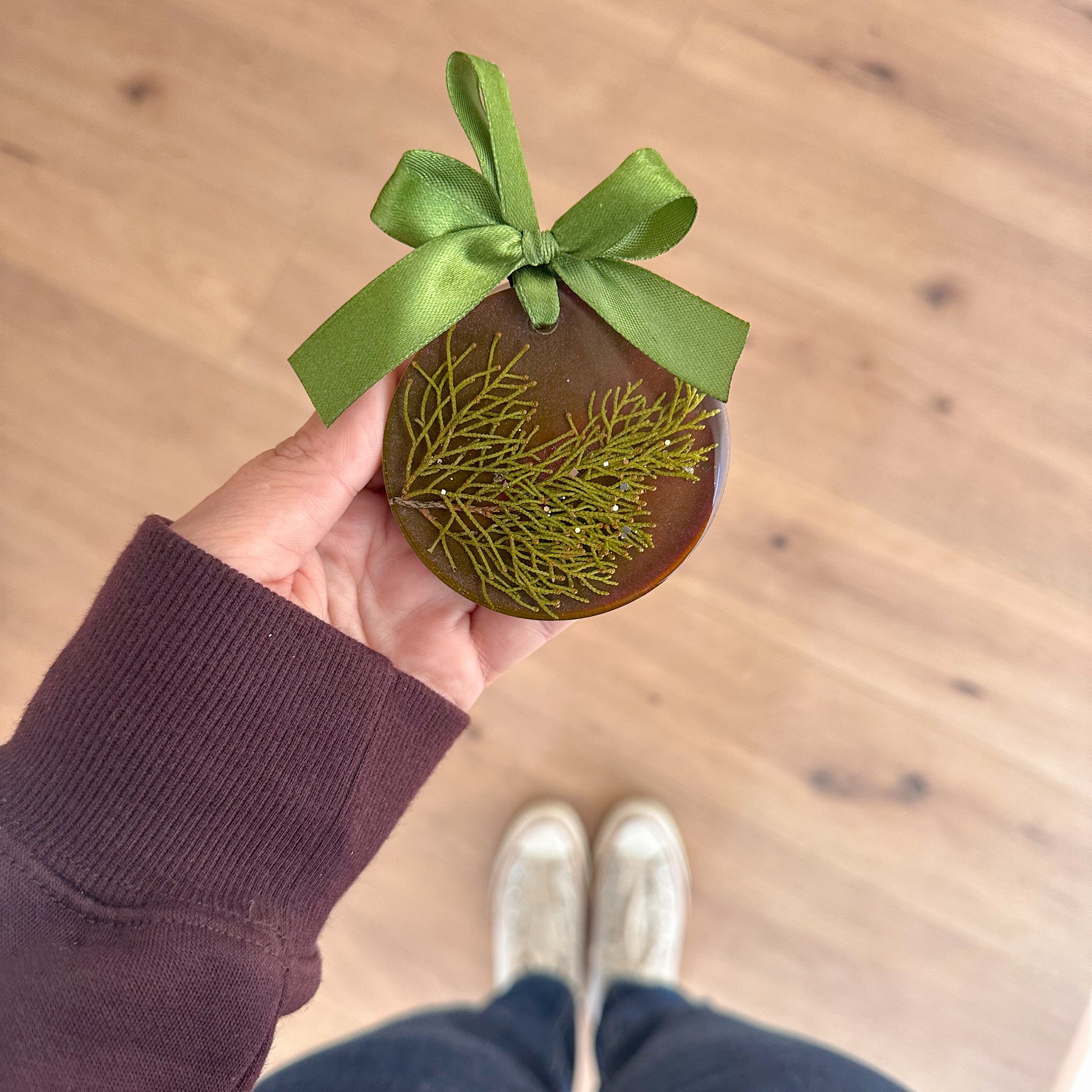 Estes ornamentos artesanais trazem um delicado ramo de pinheiro prensado à mão e encapsulado em resina cristalina, preservando sua textura e beleza por muitos anos.