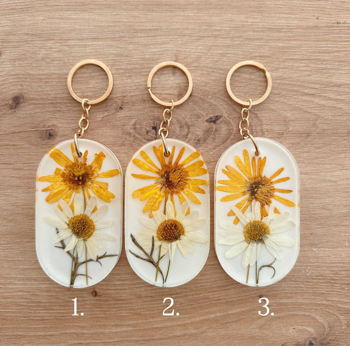 Cada porta-chaves é feito à mão com flores naturais prensadas e encapsuladas em resina para eternizar sua beleza. O acabamento com argola dourada traz um toque sofisticado.