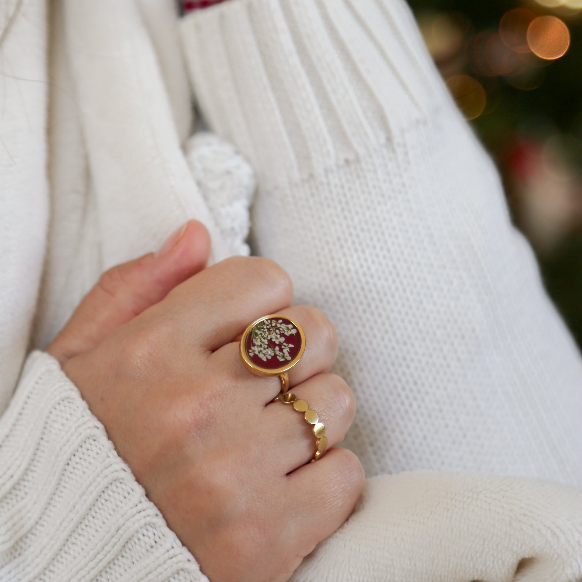 Cada anel é feito à mão em aço inoxidável dourado, com mini flores de Renda da Rainha prensada e preservada em resina.